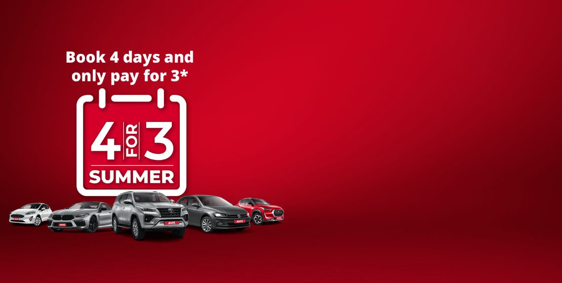 Book a minimum of four consecutive days and get one of those at no cost. Plus, if you book a Group A vehicle, you’ll automatically be upgraded to a Group B vehicle. To take advantage of this great summer deal, book with Avis from 15 October to 12 December 2025 and from 8 to 31 January 2026. Use the following discount codes when you book: